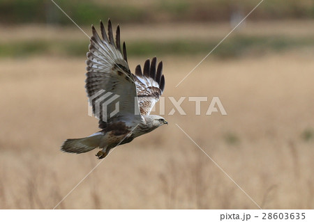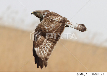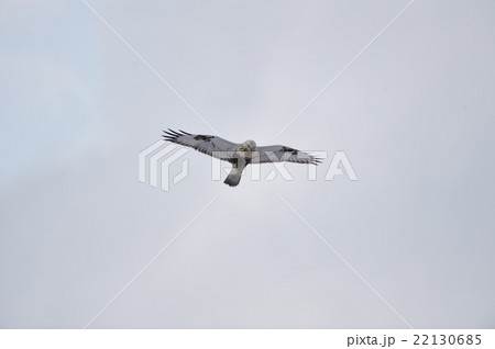 飛翔する美しいケアシノスリ(タカ科)。 日本国群馬県、利根川河川敷にて。