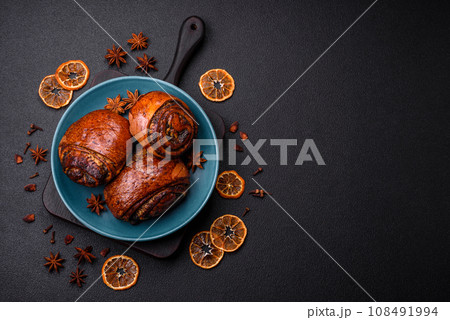 Delicious fresh sweet baked buns with poppy seeds and cinnamon on a ceramic plate