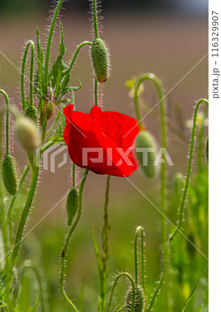 graceful red fragile poppies in the meadow, summer atmosphere on a poppy field