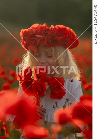 Portrait of cute child girl in poppy field. Stylish kid in dress very happy with poppy bouquet in field. Girl in poppies in white dress