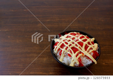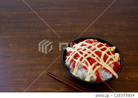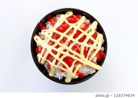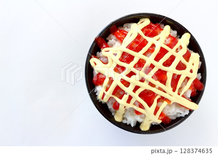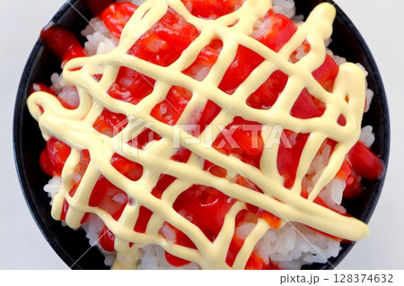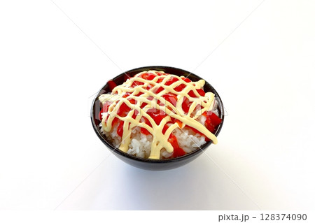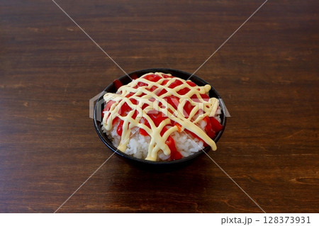 白背景のケチャップとマヨネーズをかけたご飯・ケチャマヨご飯