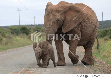 elephant walking on road with her child