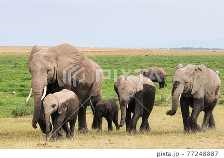 6月のケニアアンボセリ国立公園 サバンナにある沼から出てきた象の家族