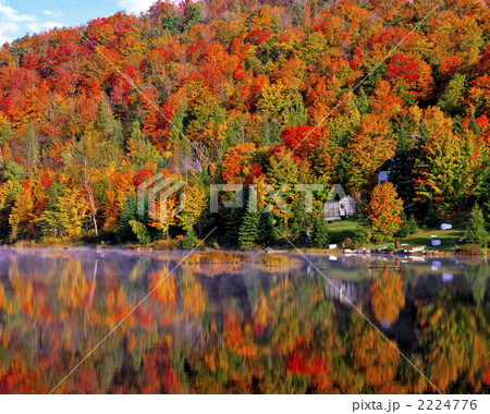 カナダ・ケベック州のモン・トランブランの湖畔のリゾートと紅葉