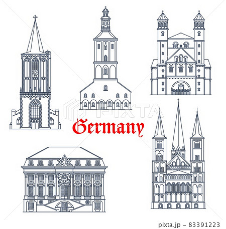 Germany travel landmarks and architecture buildings of Cologne and Bonn, vector. German architecture of St Ursula and Severin basilica, Saint Pantaleon Church, Bonn Minster or Bonner Munster cathedral