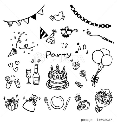 手描き風パーティモチーフセット モノクロ線画ベクター素材
