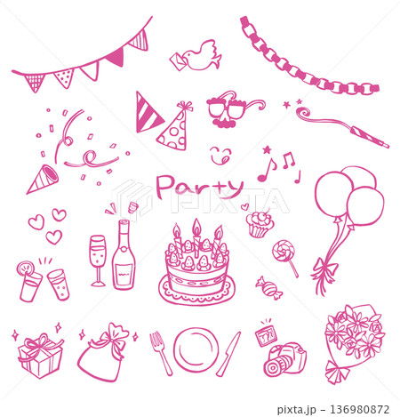 ピンクの手描き風パーティモチーフセット 線画ベクター素材