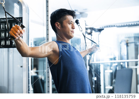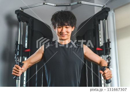 ジム・トレーニングジムでパワーラックのケーブルを使って胸の筋トレをする若いアジア人男性