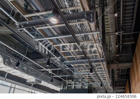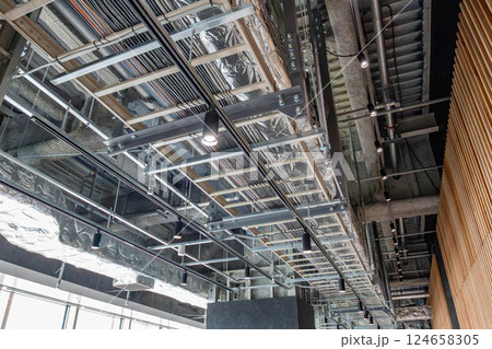 鉄骨造のロックウール耐火被覆と空調ダクト、ケーブルラック