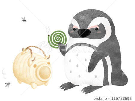 蚊遣り豚と蚊取り線香を持つペンギンの水彩イラスト