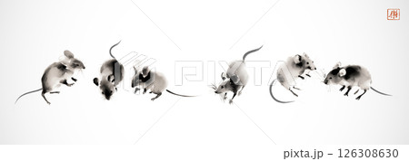Ink wash painting of mice in various poses on rice paper background. Traditional oriental ink painting sumi-e, u-sin, go-hua in vintage style. Hieroglyph - joy