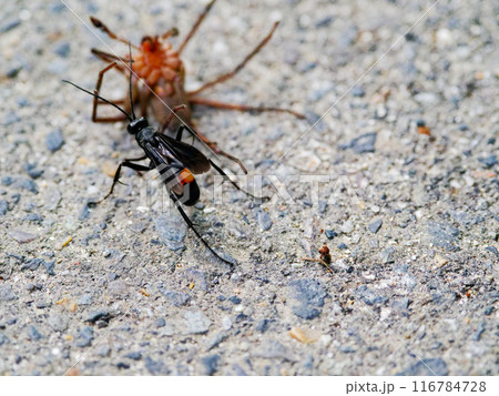 森林性クモアシダカグモ科コアシダカグモを狩るベッコウクモバチ