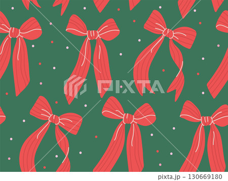 Cute Xmas ribbon bows seamless pattern. Coquette Christmas background in red and green colors. Whimsical girly vector design.