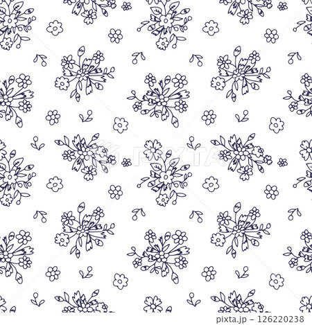 Monochrome ditsy floral seamless pattern on white background. Hand drawn vintage backdrop with tiny flower bouquets. Cottage core texture