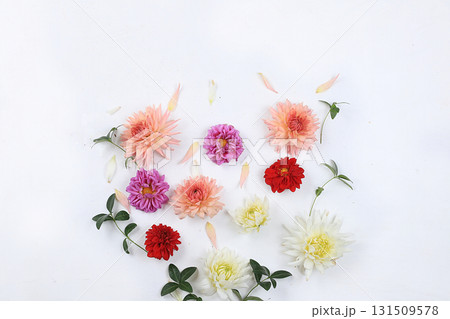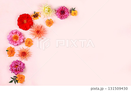 Frame of dahlia flowers, abstract floral arrangement, spring or autumn background with place for text, minimal holiday concept, still life, greeting card. selective focus