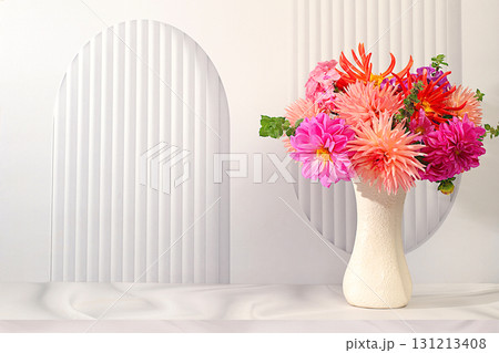 Abstract floral arrangement and autumn still life with seasonal flowers, Beautiful dahlia flowers on light background, backdrop and banner for screen, minimalist holiday concept, greeting card
