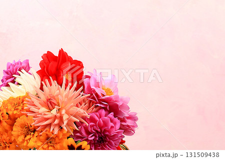 Bouquet of beautiful dahlias and marigolds on an old pink background in grunge style, abstract floral arrangement, spring or autumn background with space for text, minimal holiday concept, discreet