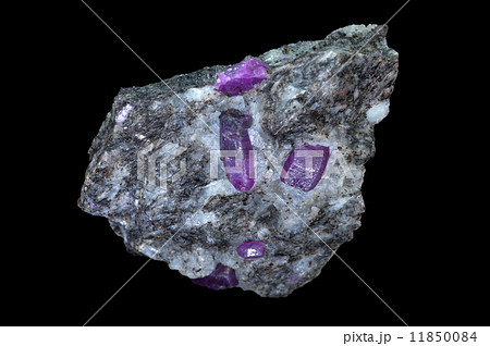 corundum crystals in gneiss stone on dark