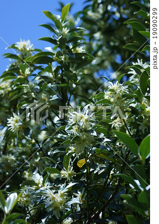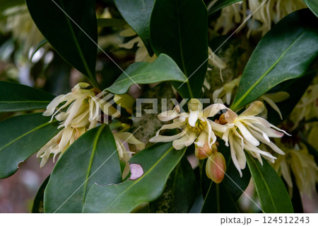 緑の葉とクリーム色のシキミの花(田の神様の境内のコウノキ)