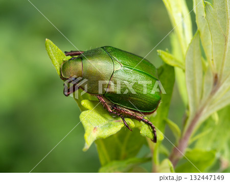 春5月ヤブガラシの葉の上を這うマメコガネムシ