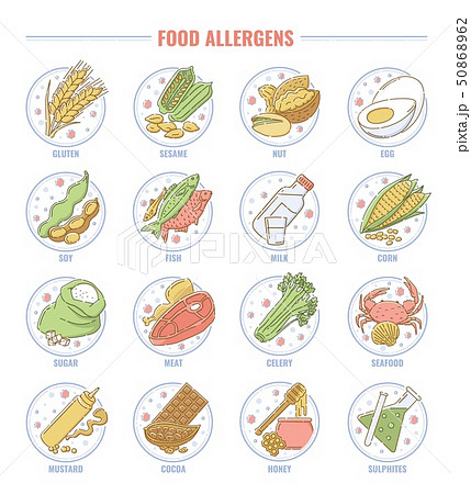 Food allergen set, collection of gluten, nut, fish, milk, lactose, edd, and other allergy products