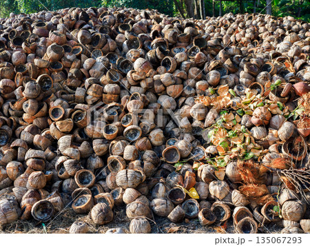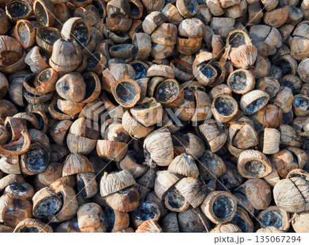 大量のヤシ殻を外で乾燥させている風景 エコロジー