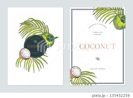 Creative poster template design, line art illustration of coconut and various leaves on white