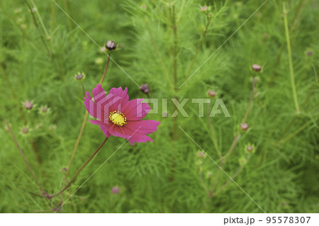 濃いピンク色のコスモス一輪