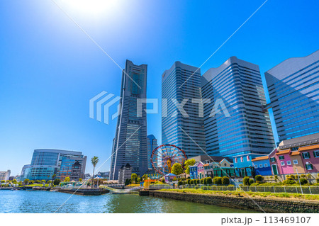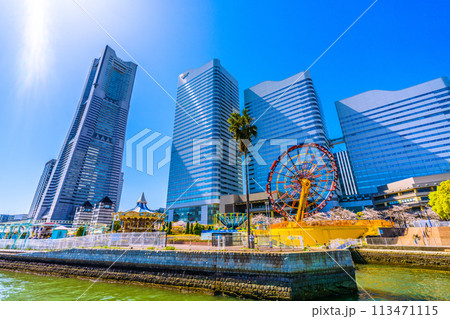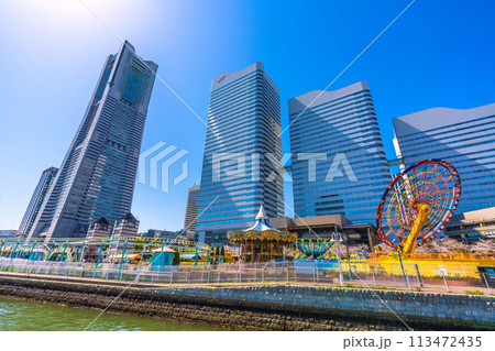 日本の横浜都市景観 スーパープラネットや横浜ランドマークタワーやクイーンズスクエアなどを望む