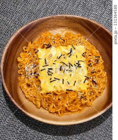 Spicy and flavorful buldak topped with melted cheddar cheese, creating a rich and creamy contrast to the intense heat. A perfect balance of bold spice and cheesy indulgence for a satisfying meal.