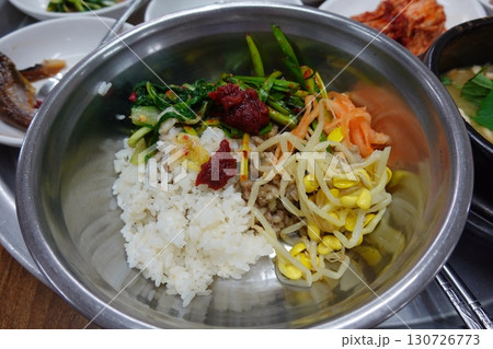 Bibimbap, a vibrant Korean rice dish topped with a variety of seasoned vegetables, gochujang, and a fried egg, often accompanied by sliced meat. Mixed together, it creates a flavorful and balanced.