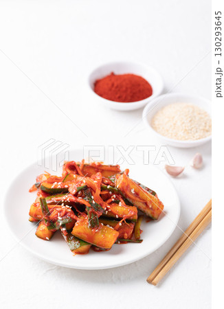Korean kimchi cucumber on white background, Korean side dish, Homemade food