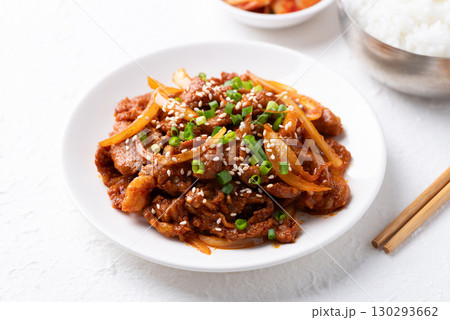 Korean stir fried spicy pork (Bulgogi) with cooked rice and kimchi