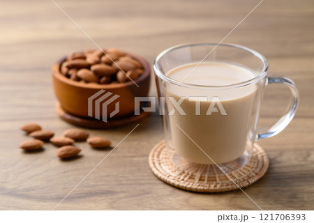Almond milk in cup glass on wooden table, Alternative milk made from plant, non dairy