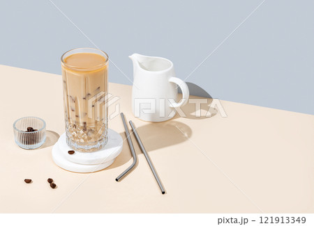 Iced coffee latte in a tall glass with alternative milk on a yellow and blue background