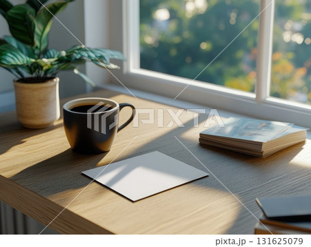 Coffee Cup And Potted Plant On Wooden Desk Near Window With Natural Light And Shadows
