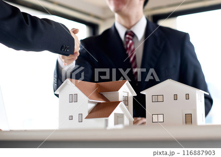 建築模型の前で握手する男女のビジネスマン