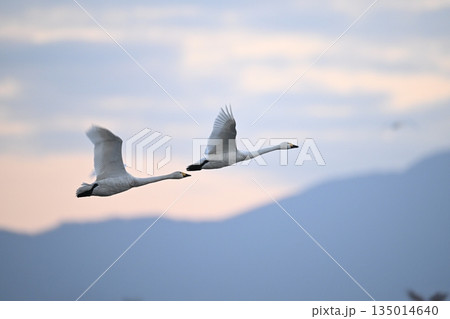 朝焼けに飛ぶ白鳥