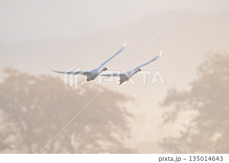朝霧の中を飛ぶ白鳥