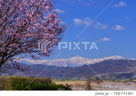 長野県長野市篠ノ井東福寺 松代桜づつみ公園の桜と北アルプスの景色