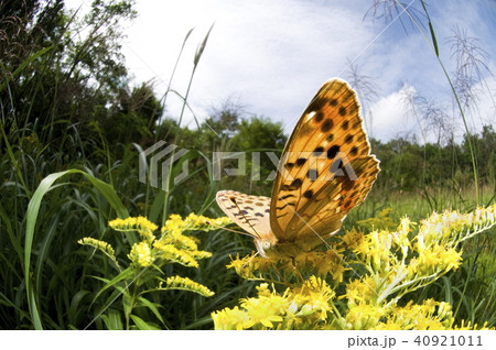 初夏の高原ヤナギランやアザミの花に訪れるオレンジ色の色鮮やかチョウ、コヒョウモン