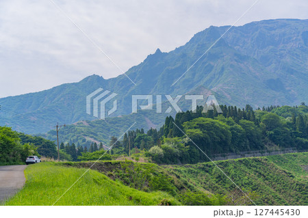 (熊本県)新緑の阿蘇 仙酔峡に向かう道路を走る車
