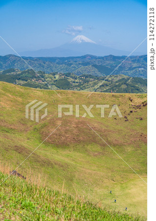 (静岡県)新緑の大室山・山頂の景観と後方に富士山
