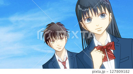 広がる青空、高校生または中学生の男女のアニメ風イラスト、左に余白