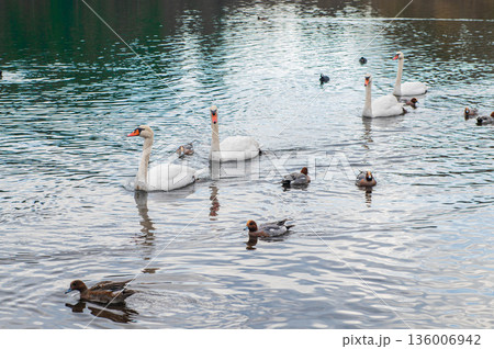 公園の池の静かな水面にいる白鳥