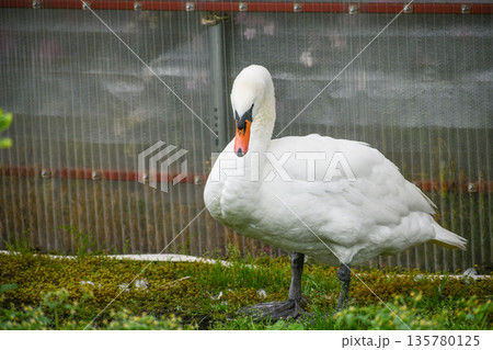 陸に上がって休むコブハクチョウの幼鳥