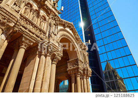 USA, Massachusetts, Boston, John Hancock Tower and Trinity Church at Copley Square in fog