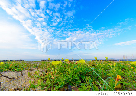 神奈川県茅ケ崎市の西浜海岸の浜辺で咲くコマツヨイグサの群生【5月】