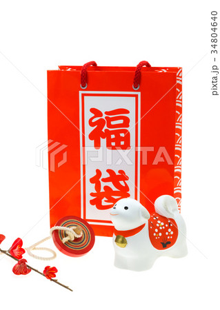 戌年 年賀素材〜福袋と白い犬と独楽