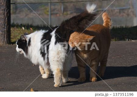 公園で出会う二匹の猫、朝のあいさつシーン